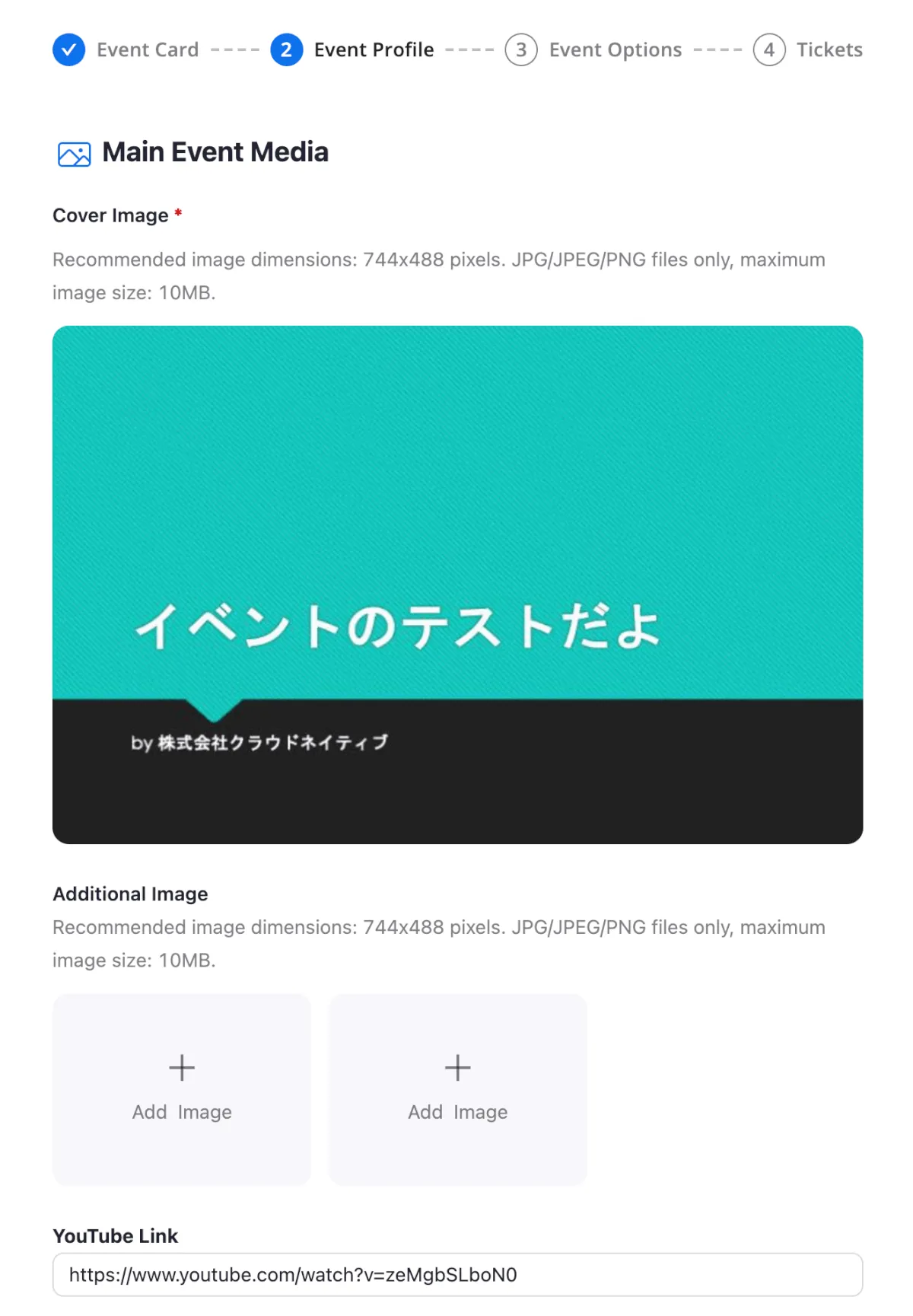 画像サイズ744×488 pixelで設定します。最大3枚までの画像とYoutubeリンクを貼ることができます。