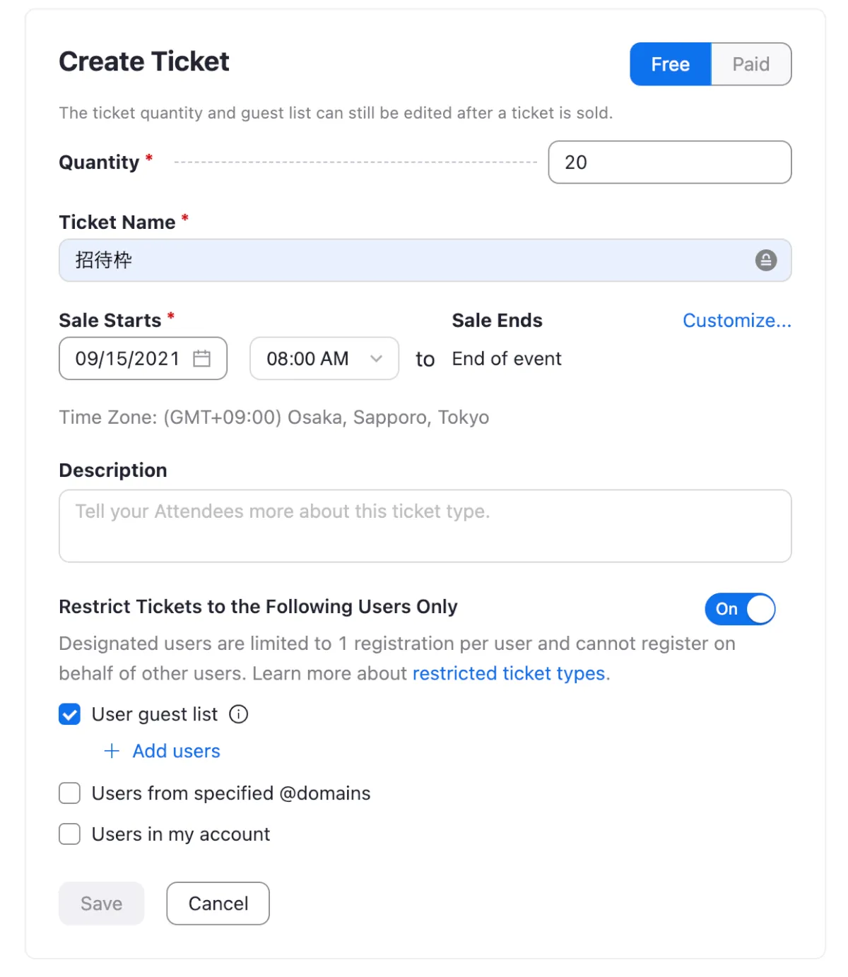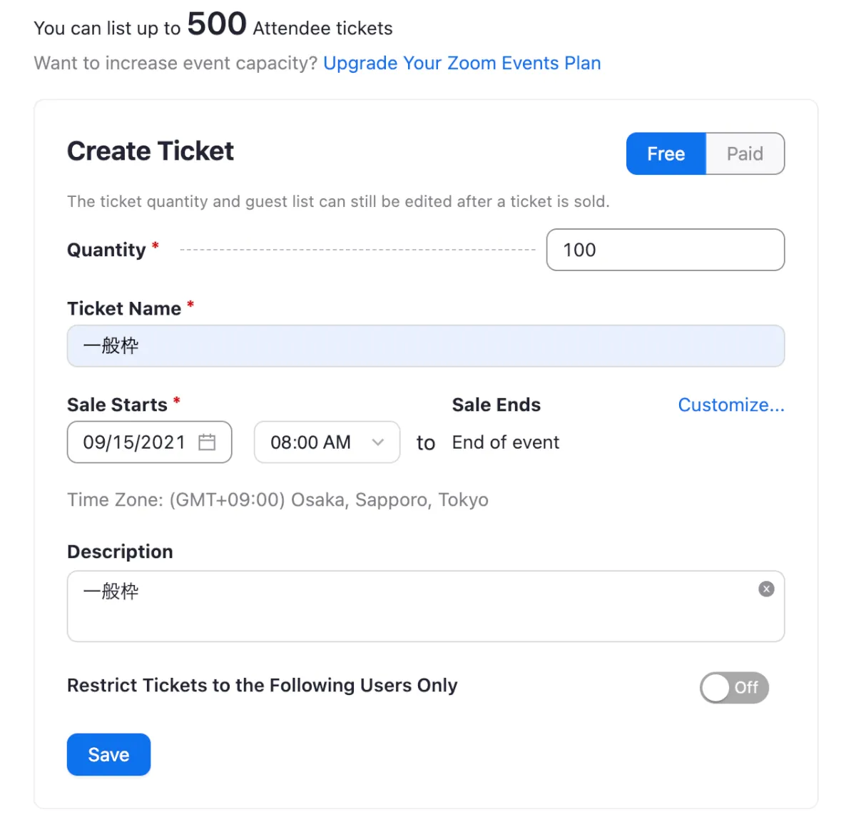 本来は無料と有料のチケットを作成できますが有料チケットの販売の場合は銀行口座との紐付けなどの作業があり日本向けにはまだ対応していないようでした。