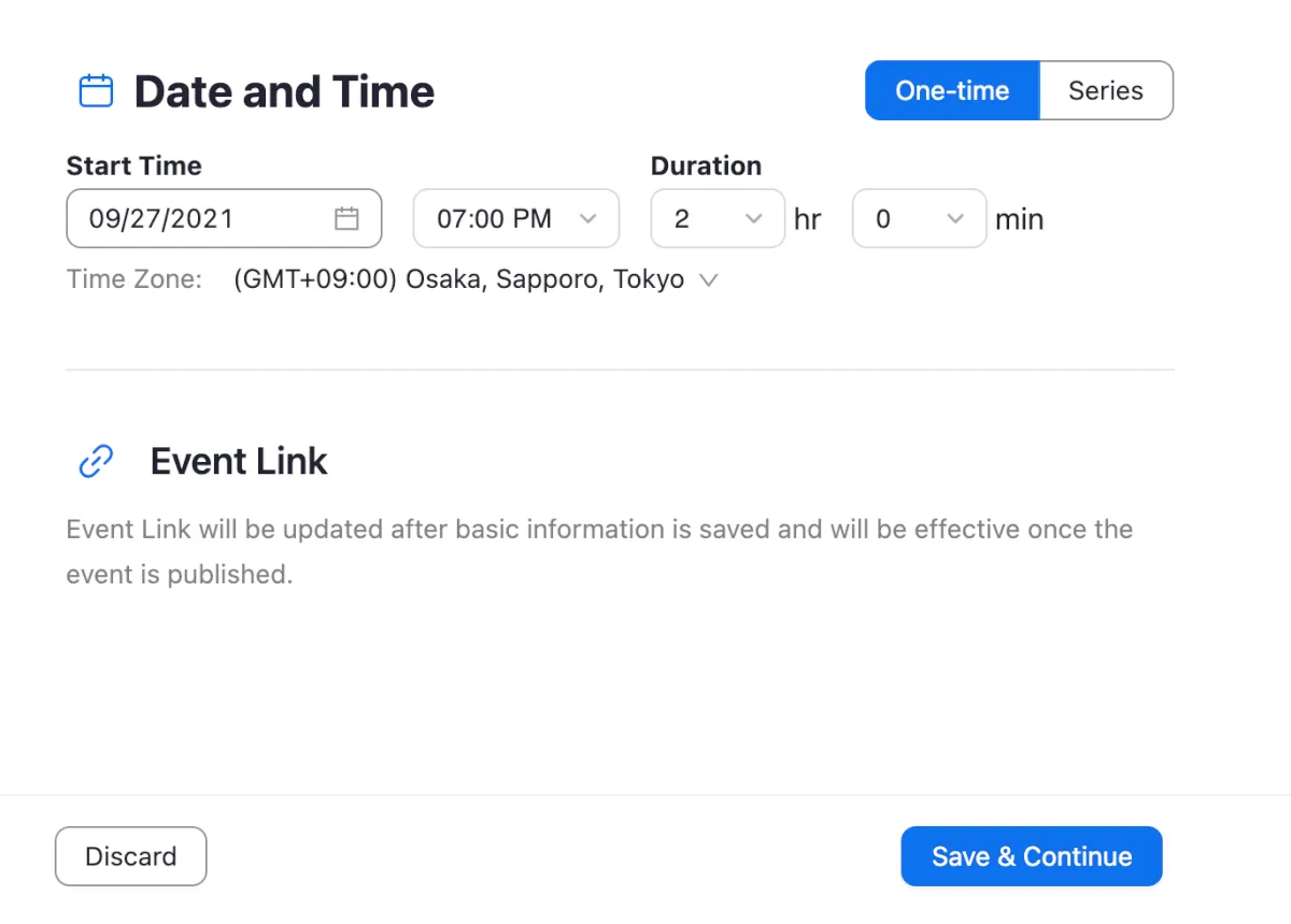 Seriesを選択した場合は、1日おきや1週おき1月おきに同じ時間帯で繰り返しイベントを開催することができます。2.Event Profile