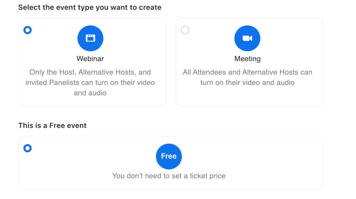 ウェビナーかミーティングのどちらかを選択します。