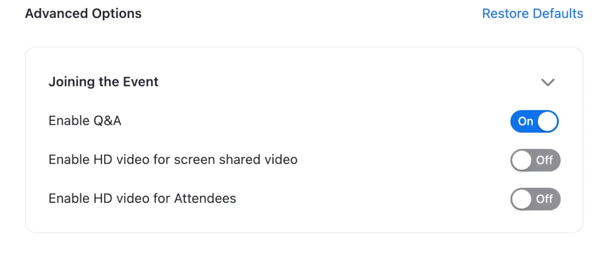 オプションとしてイベント中のQ&AやHD画質をオンにするかを選択できます。必要に応じてデフォルト設定から変更しておきます。