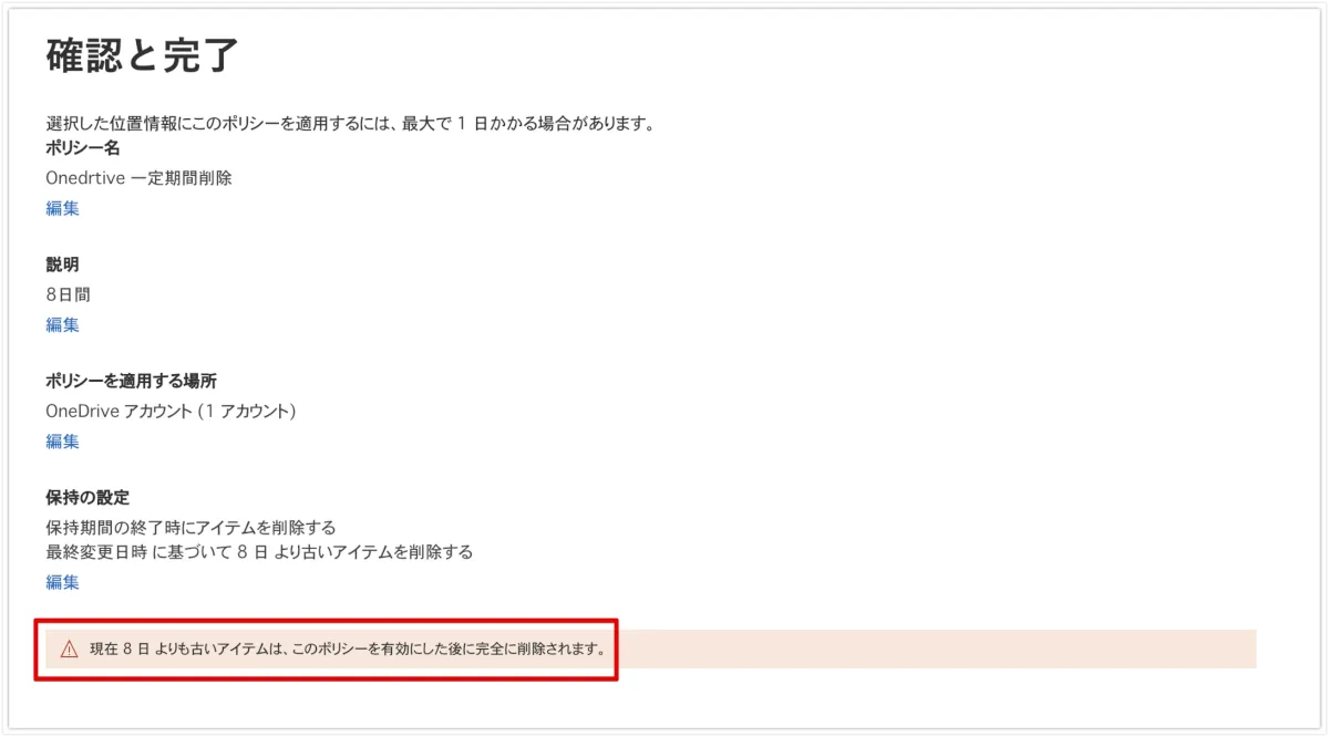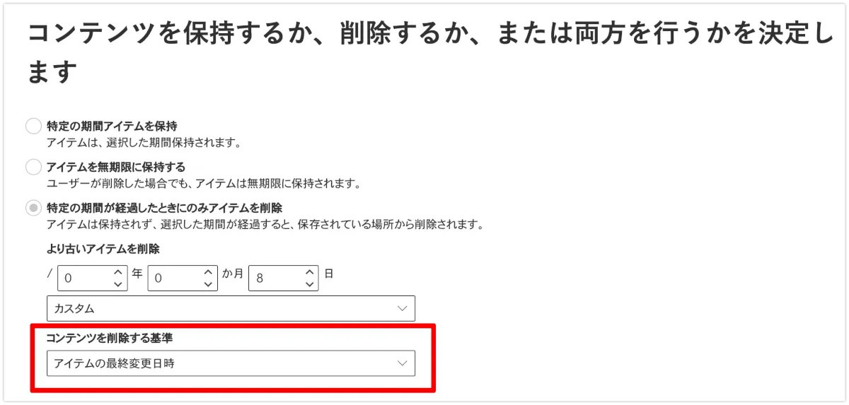 具体的には、保持ポリシーを利用して一定期間経過後に該当アカウントのファイルが自動削除されるように設定するという手順になります。