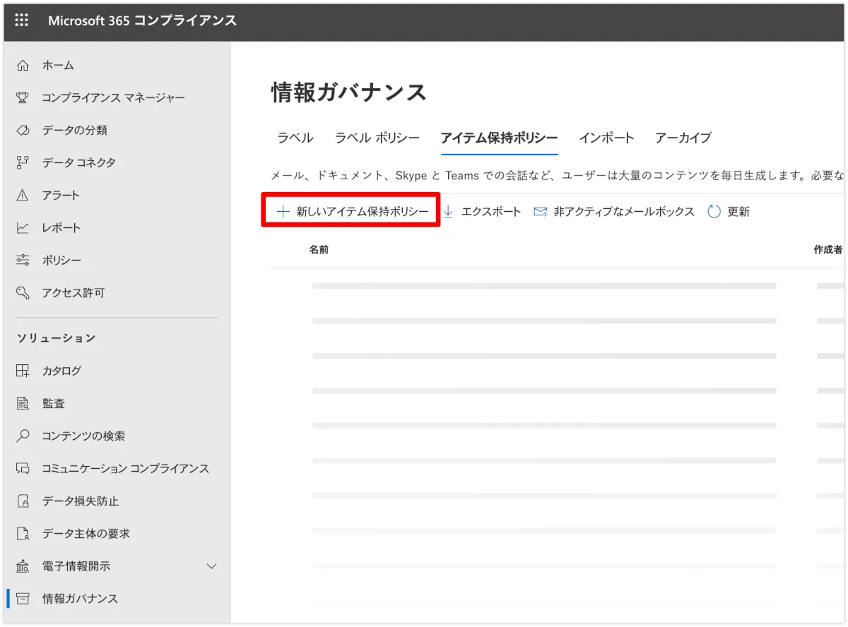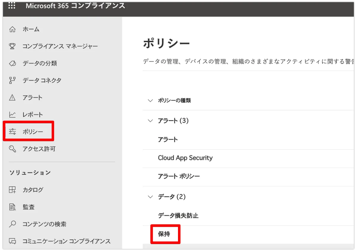 次に保持ポリシーを設定します。”コンプライアンス”内の、”ポリシー”のさらに中の”保持”になります。