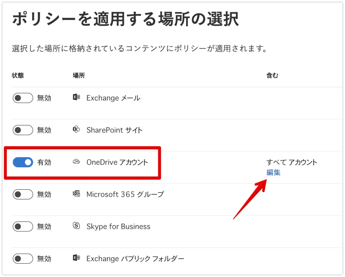 次に、削除対象の指定を行います。OneDriveのみを有効として残し、”編集”から対象アカウントを指定します。