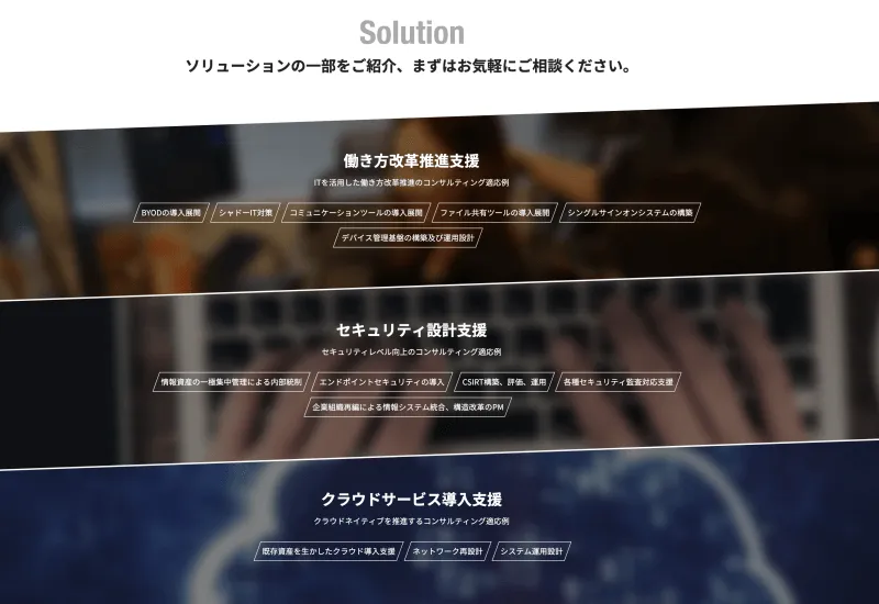 もともとのサービスページは、クラウドネイティブができることを箇条書きにしたようなページでした。分かる人には分かる。けど何か目的があってサービスページを見に来た人はどこに情報があるのか探さないといけない。また漠然とした悩みの方には不親切なページでした。サービスの見せ方をソリューションカットにすることで、当たりがつくようにしています。また、実際に利用した際にどのようなことが始まるのか、お客さま先への訪問へ同行して最初のプロセスが手厚いのにその事がWebから伝えられていないことがもったいないと感じ、コンサルティングのプロセスも追加しました。依頼される方の課題が整理できていなくても、プロセスを知ることで少しは不安を取り除き、問い合わせがしやすくなればなぁ、という工夫をしてみました。