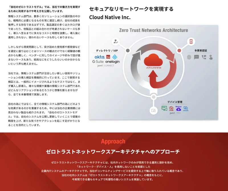 このページに関しては、クラウドネイティブの実力を裏付けるページになっています。代表のシンジやエンジニアに協力してもらいながら仕上げています。 詳しい人が見るとスラスラ読めて理解できるページではあるのですが、非エンジニアの私のフィルターを通しているので分からなくても頑張って読めばなんとなく分かる内容になっています。 そして、文章読むことが嫌いな方のために、長文でも読みやすいデザインにしていただいています。ゼロトラストの図がシンプルで分かりやすくてお気に入りです!!