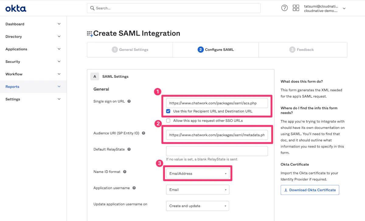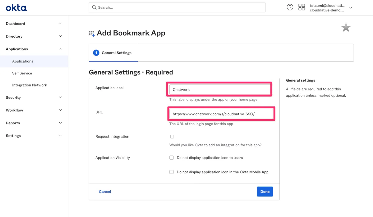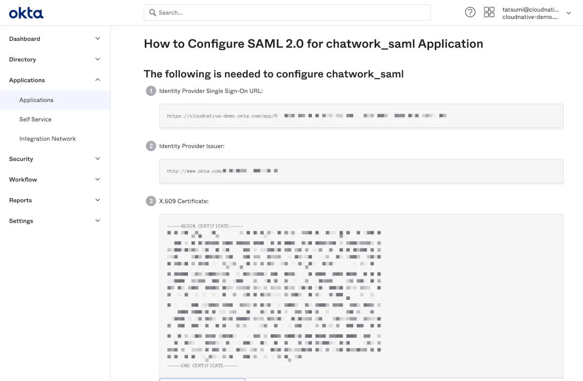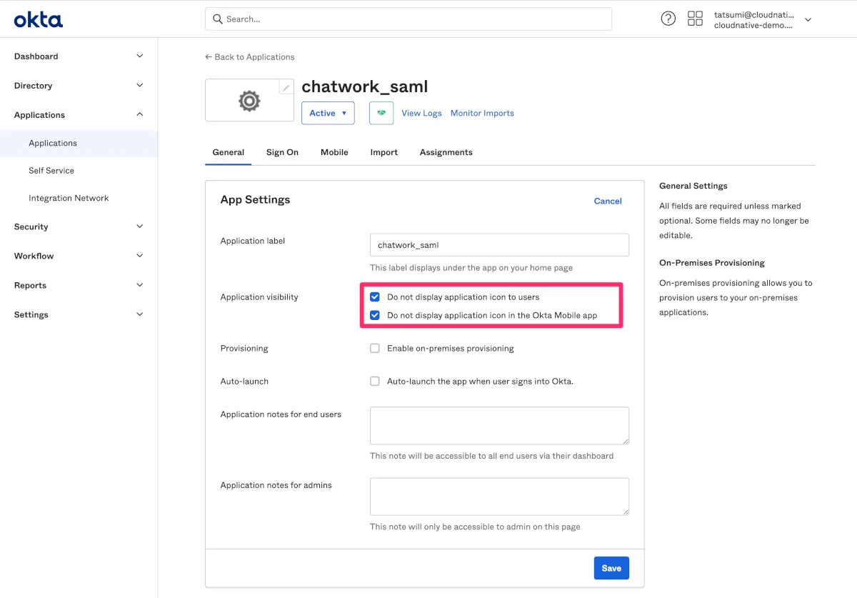 - Oktaのchatwork_samlアプリケーションのGeneralへ移動します。