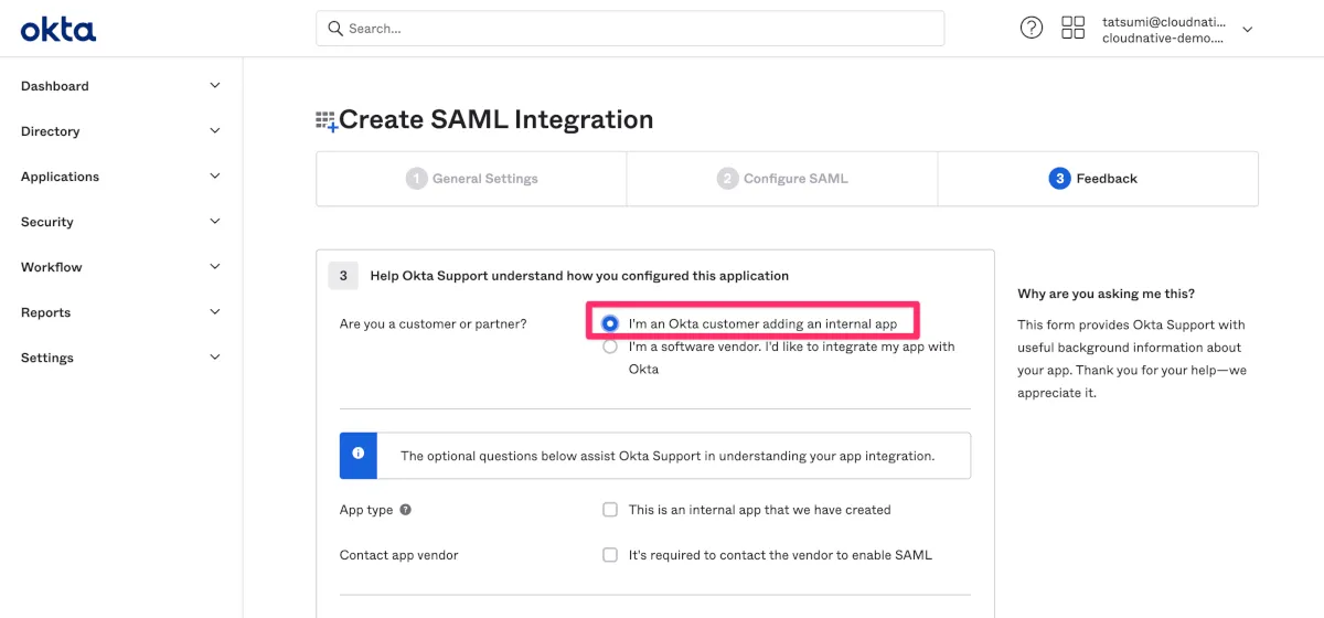 - 最後にI’m an Okta customer adding an internal appを選択し、自社内だけの設定であること示しNextをクリックします。