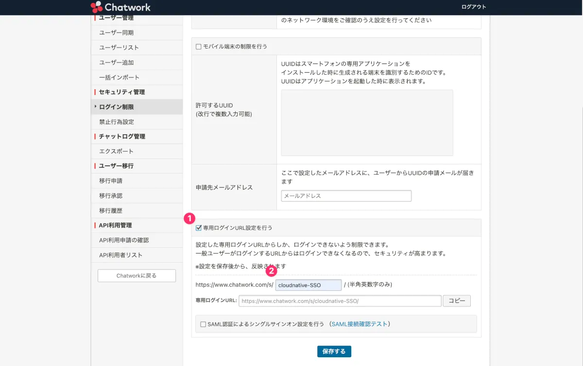 - 専用ログインURL設定を行うにチェックを入れます。