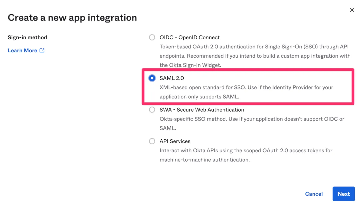 - SAML2.0を選択しNextをクリックします。