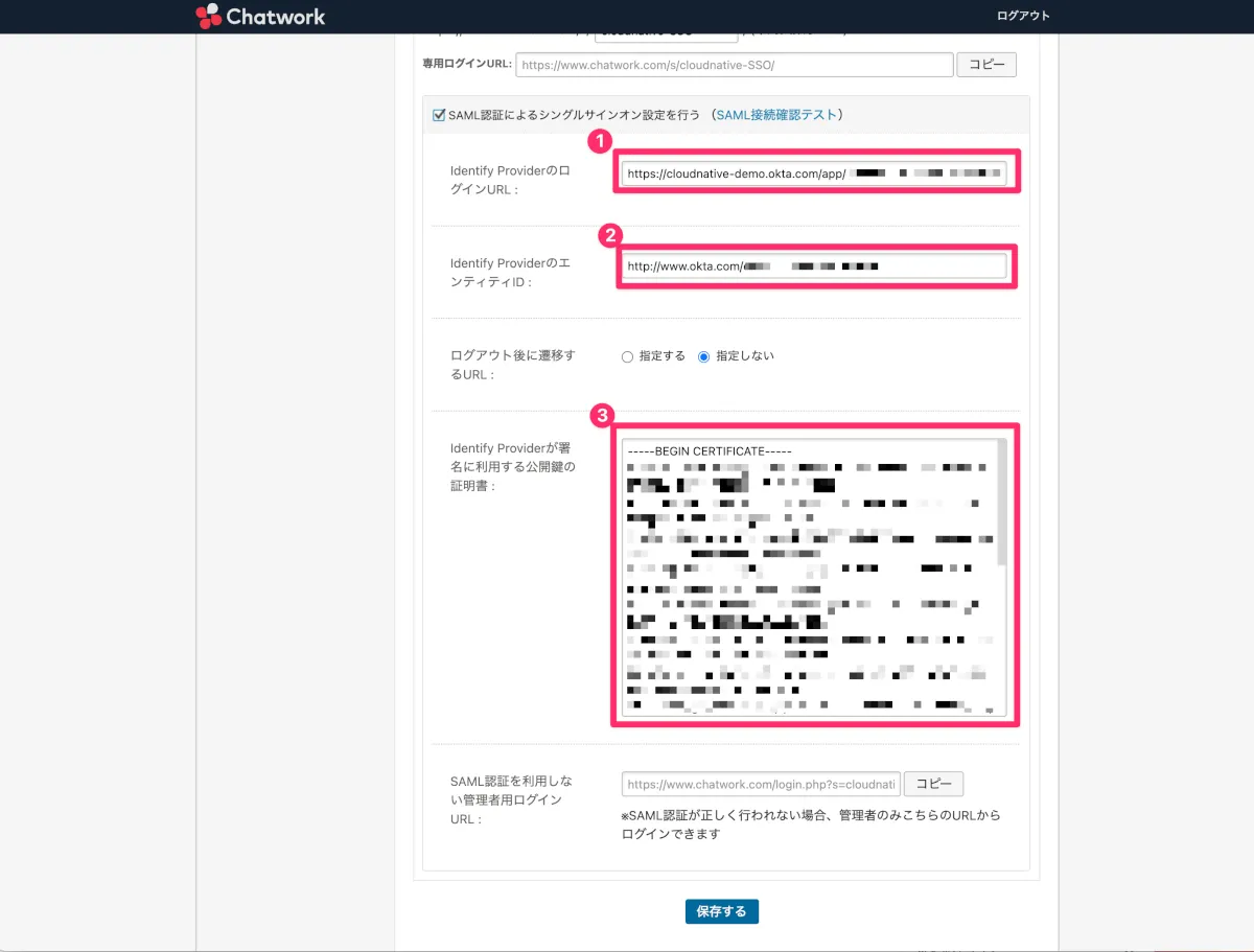 - Identify ProviderのログインURL:OktaのIdentity Provider Single Sign-On URLを入力します。