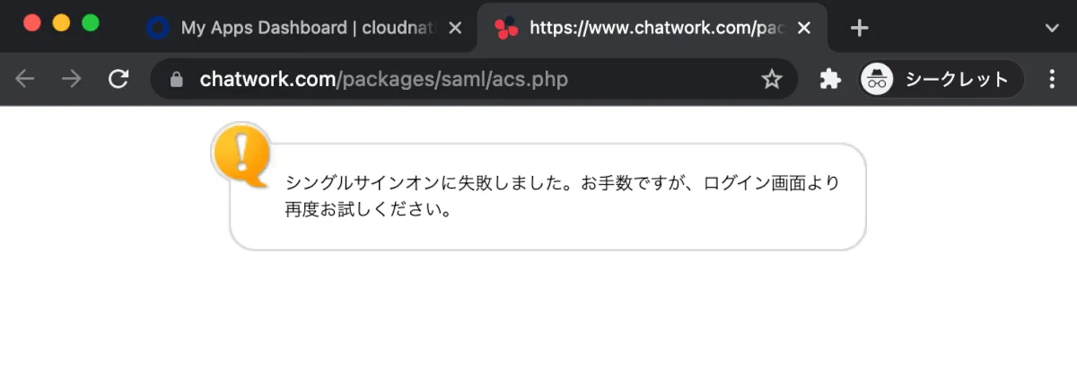 Oktaのダッシュボードからchatwork_samlをクリックし、Chatworkの画面に遷移し上手くいくかと思ったら…