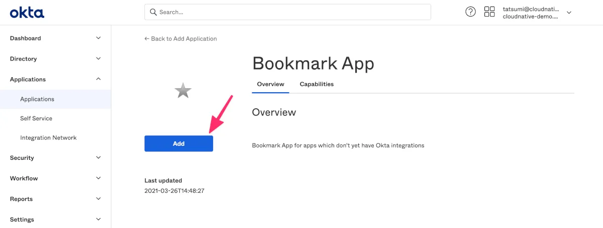 Chatworkユーザーをこのブックマークアプリにもアサインし、シークレットブラウザもしくはキャッシュをクリアしたブラウザでOktaダッシュボードから正常に遷移可能か確認します。