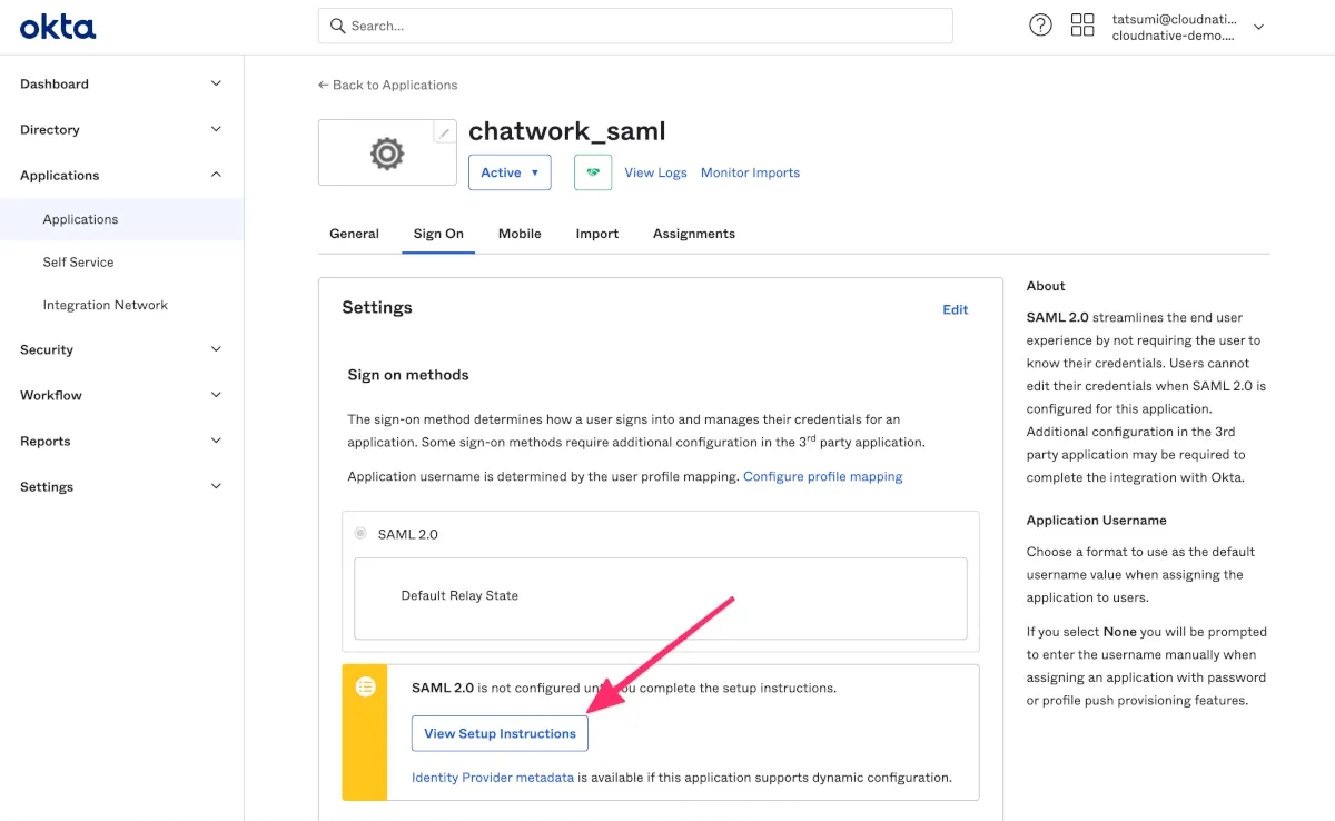 - 作成されたアプリ設定からSign On内のView Setup Instructionsをクリックします。