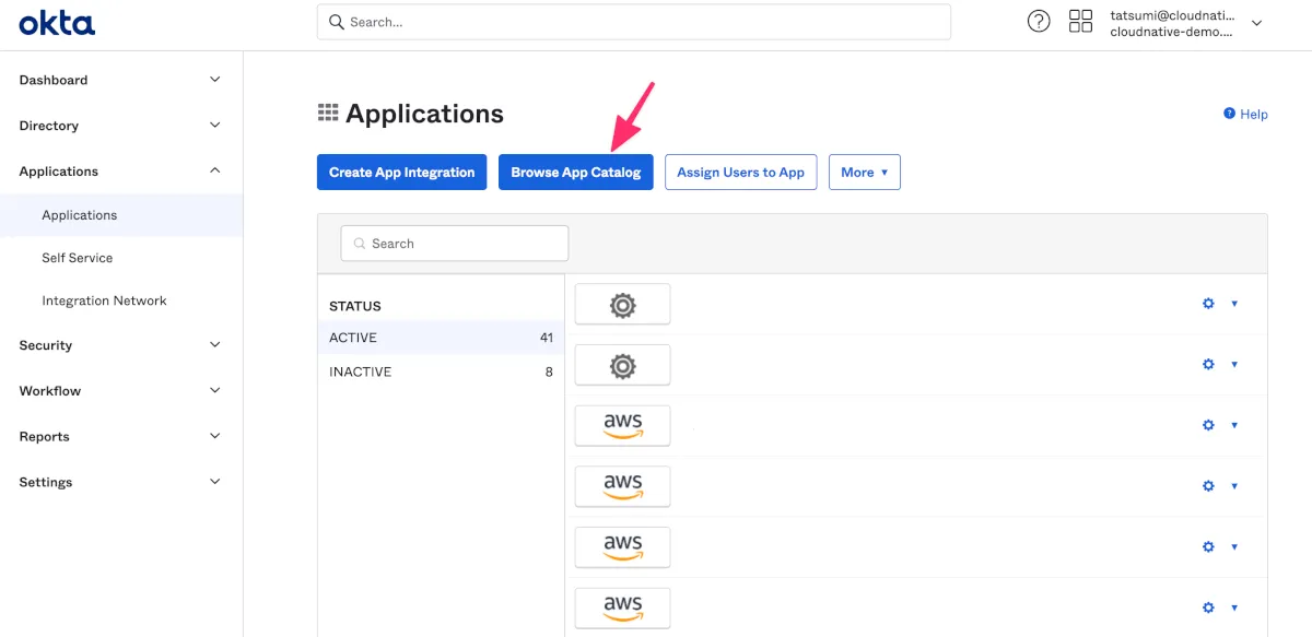 - Okta管理画面へログインし、Applications>Applications>Browse App Catalogをクリックします。