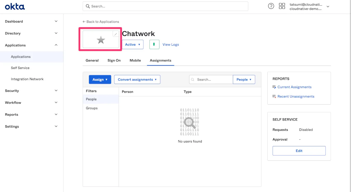 Oktaに戻ってchatwork_samlにchatworkユーザーをアサインして、シークレットブラウザもしくはキャッシュをクリアしたブラウザでログインを試します。