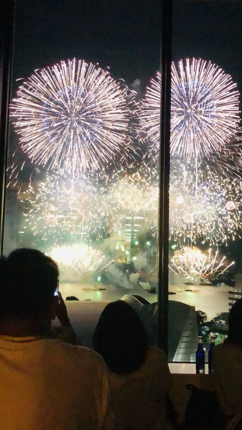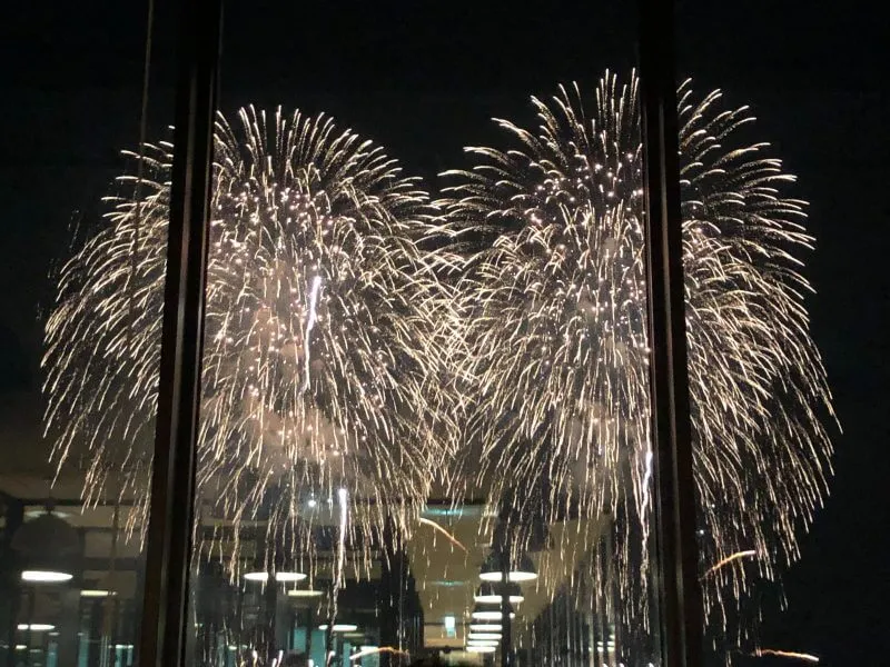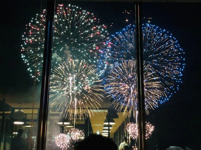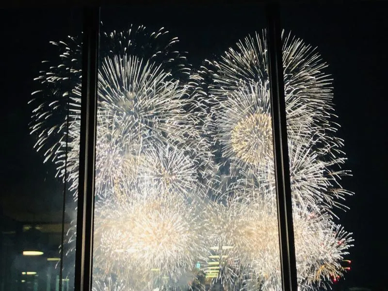 7階から花火を見たのですが、何もさえぎる建物が無く、花火観賞の一等地!本当に目の前で花火がバンバン上がる!!しかも、上から見ているので下の海から上がってくる花火も見えて、もう、最高!!