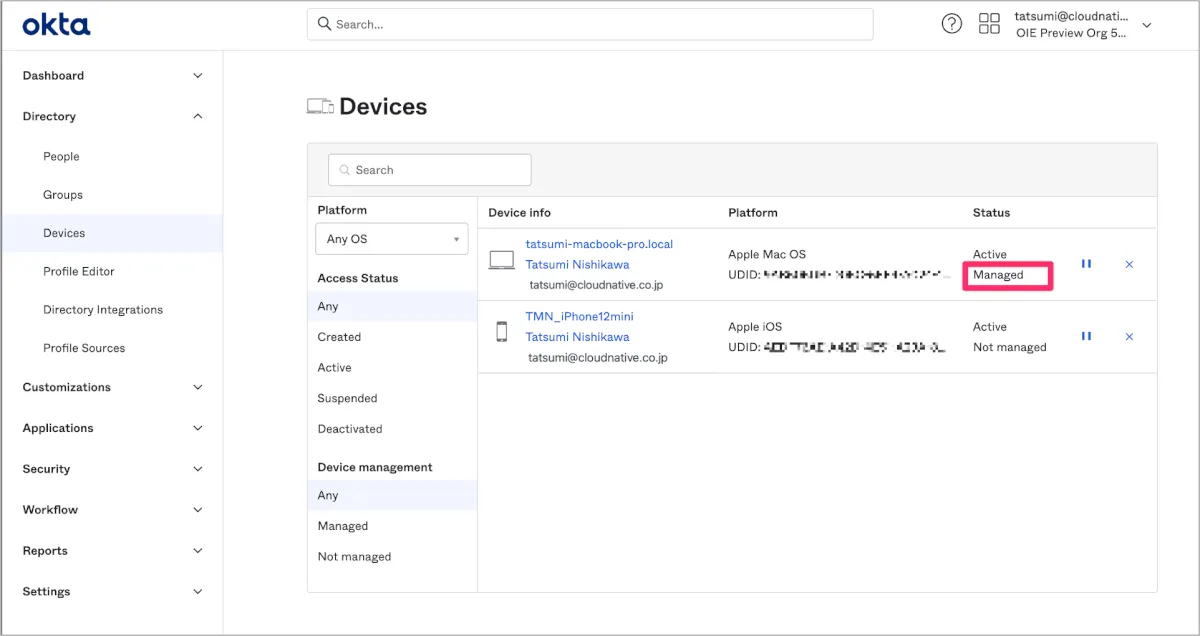Okta管理画面のDirectory内のDevicesに該当端末のStatusがManagedとなっていることを確認します。