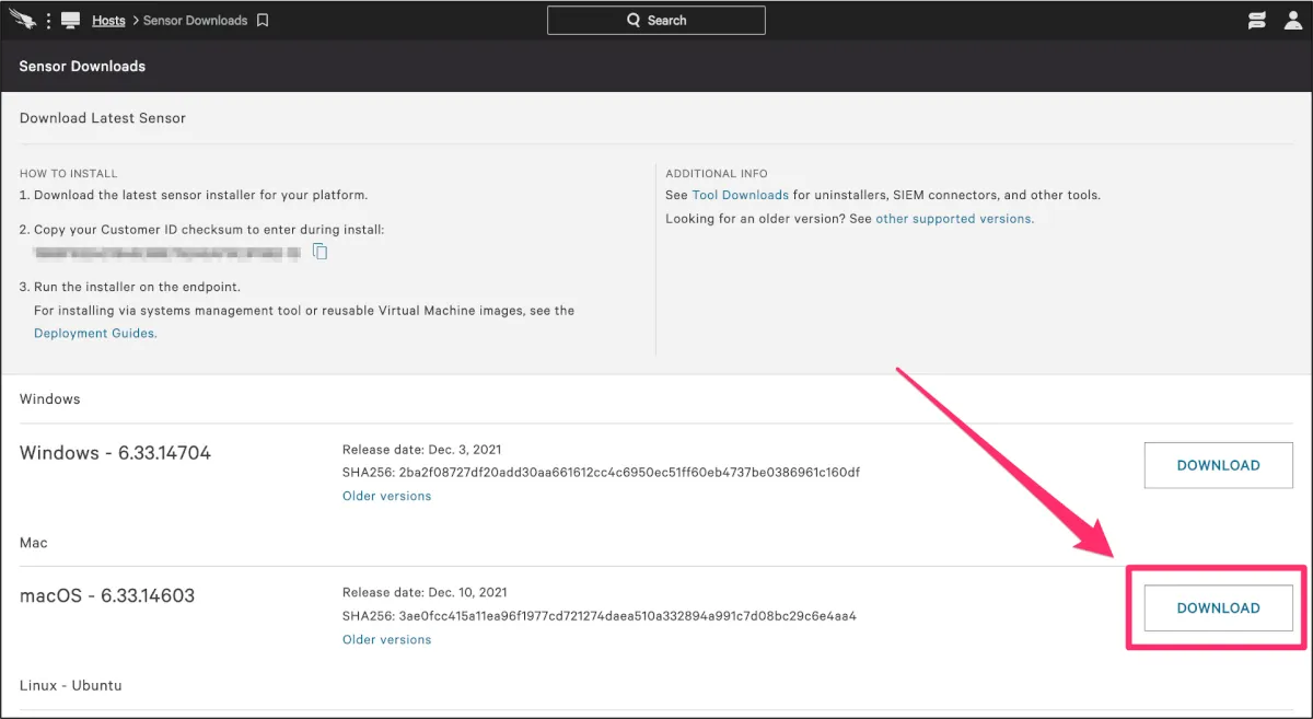 Falcon Sensor のパッケージを Falcon Console(CrowdStrike管理画面) からダウンロードしておきます。Falcon Console にログインして [Hosts] > [Sensor Downloads] ページから最新の Mac 用パッケージを ダウンロードしてください。