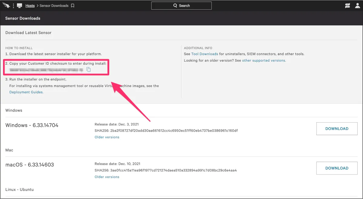 Falcon Sensor のインストールには、チェックサム付きの Customer ID(以下、CID)が必要です。CID は、Falcon Console にログインして以下の Support > Sensor Downloads ページの上部に「<32 文字の英数字>–<2 文字の英数字>」の形式で記載があります。