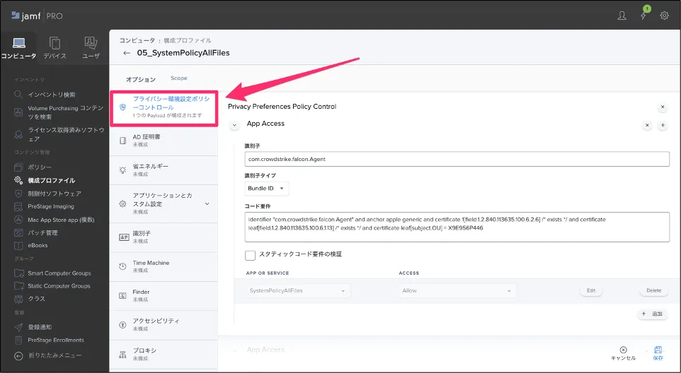構成プロファイル「SystemPolicyAllFiles」の作成