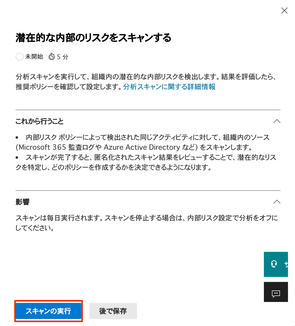 - トップページの開始に最も役立つアクションの中の潜在的な内部のリスクをスキャンするをクリックします。