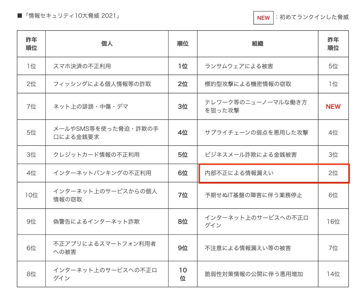 IPAの10大脅威でも内部不正による情報漏洩がランクインしています。