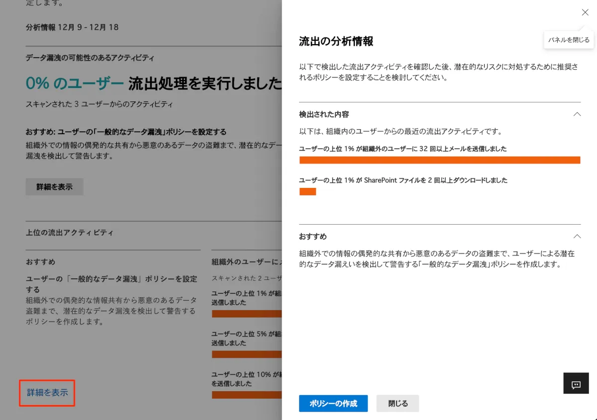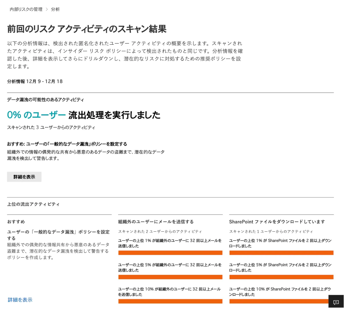 - スキャンの結果、0%のユーザーが流出処理を実行しましたのメッセージから、データ漏洩のアラートはあがっていないようですが、自社組織外にメールを送信した形跡やSharePointからファイルをダウンロードした形跡が出てきました。