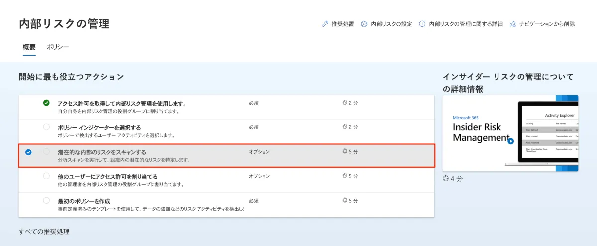 - 開始に最も役立つアクションが表示されなかった場合でも、右上の内部リスクの設定(歯車マーク)を開き、分析(プレビュー)をたどりオンにします。