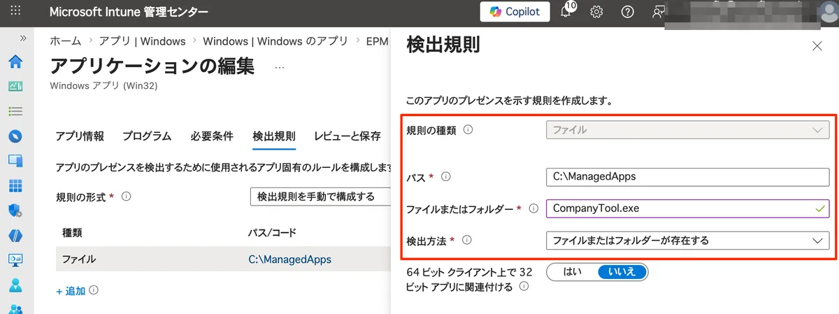 CompanyTool.exe) - 検出方法:ファイルまたはフォルダーが存在する