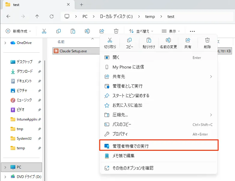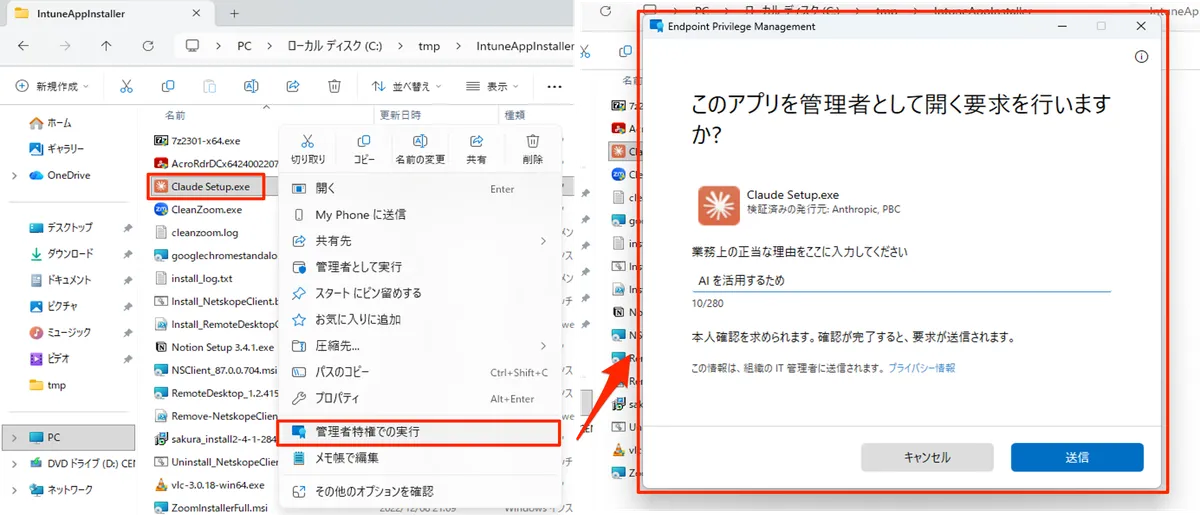 EPM が有効化された端末では、ユーザーはファイルを右クリックして [管理者特権での実行] を選択することで昇格操作を行います。EPM のエージェントがこの操作をフックし、昇格ルールや既定の昇格応答に従って処理されます。