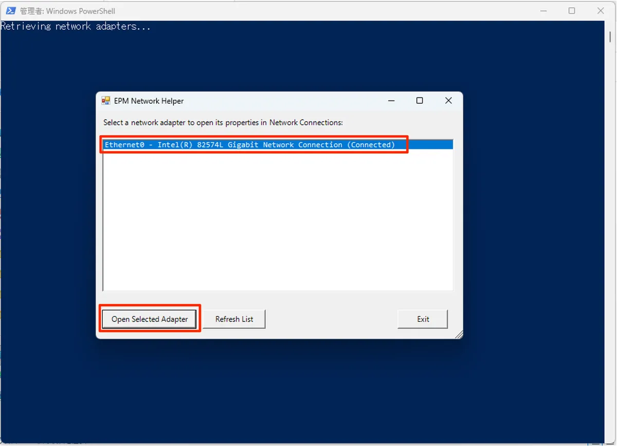 - 以下のようなポップアップが表示されるので、変更したいネットワークアダプターを選択して [Open Selected Adapter] をクリックします。