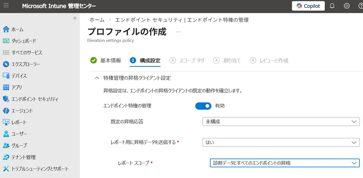 最初に 昇格設定ポリシー を配布して EPM を有効化します。以下の設定値で配布すると、エンドポイントの昇格操作が Intune に記録されるようになります。