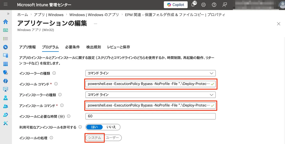 | アンインストール | powershell.exe -ExecutionPolicy Bypass -NoProfile -File ".\Deploy-ProtectedFolder.ps1" -Remove |