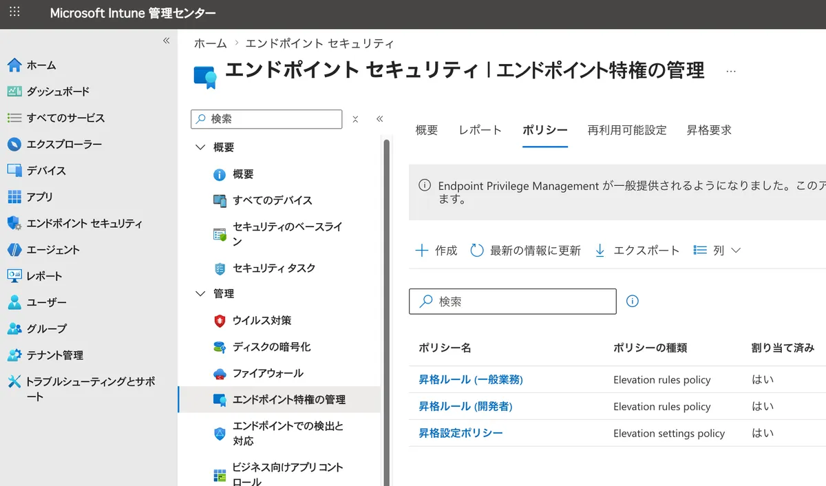 この 3 つを組み合わせて、「どの端末で EPM を有効化するか (昇格設定ポリシー) → 何を昇格できるようにするか (昇格ルールポリシー) → 実際の昇格操作を追跡する (昇格レポート)」というサイクルで運用していきます。