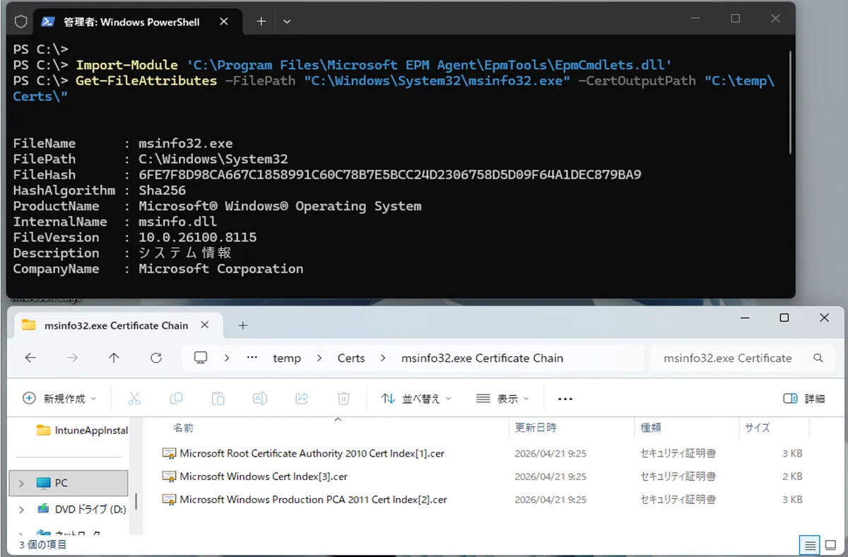 以下は昇格ルールの材料 (ハッシュ・製品名・内部名・証明書チェーンなど) を一括取得する例です。”FilePath” はフルパスで指定し、”CertOutputPath” の証明書出力パスは事前にフォルダを作成する必要がある点に注意してください。