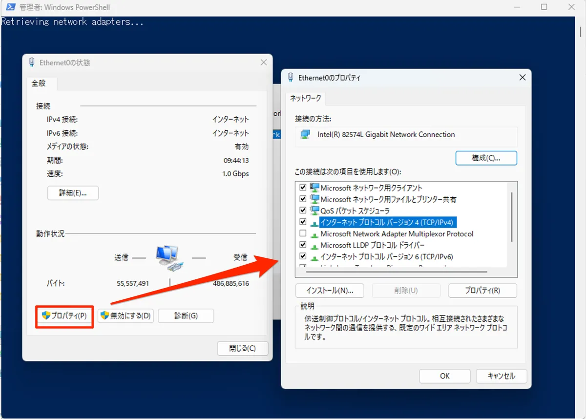 - UAC が表示されず [プロパティ] を開けるので、ネットワークアダプターの構成を変更することができます。