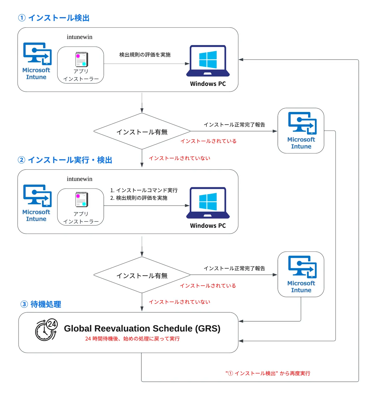 - intunewin の基本動作として、検出規則の評価が最初に行われる点を理解することがアップデート運用のカギ