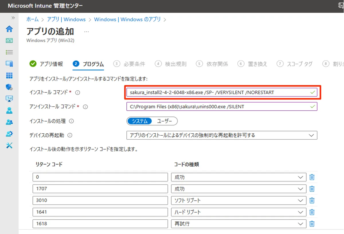 特に注意が必要なのが MSI 形式のインストーラー です。intunewin でポリシーを作成すると、アンインストールコマンドに MSI のプロダクトコードが自動で設定されますが、プロダクトコードはアプリのバージョンアップによって変わることがあります。 この場合、古いバージョンのプロダクトコードで構成されたアンインストールコマンドが新しい環境では機能せず、アンインストールに失敗するケースが発生します。