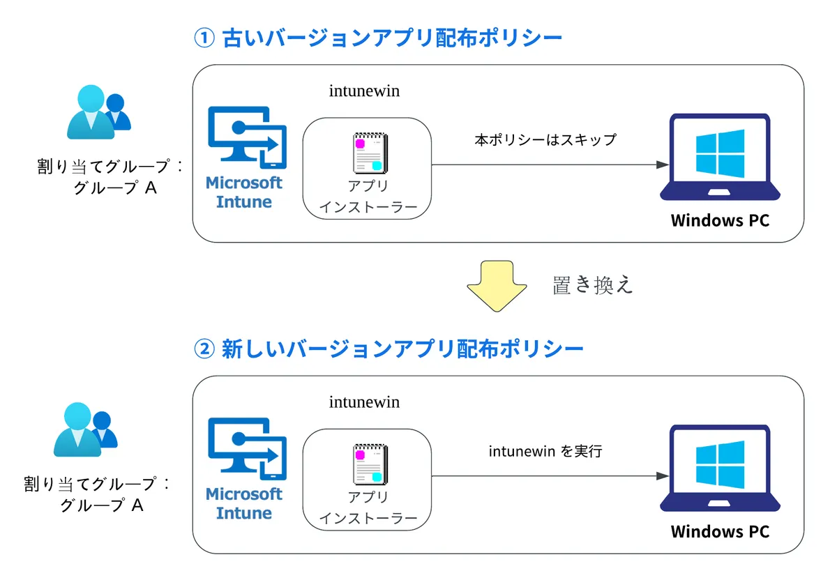 | 既存ポリシーの intunewin 差し替え (検出規則をバージョン評価に変更) | ポリシーが増えないためシンプル | 段階的な配布検証ができない |