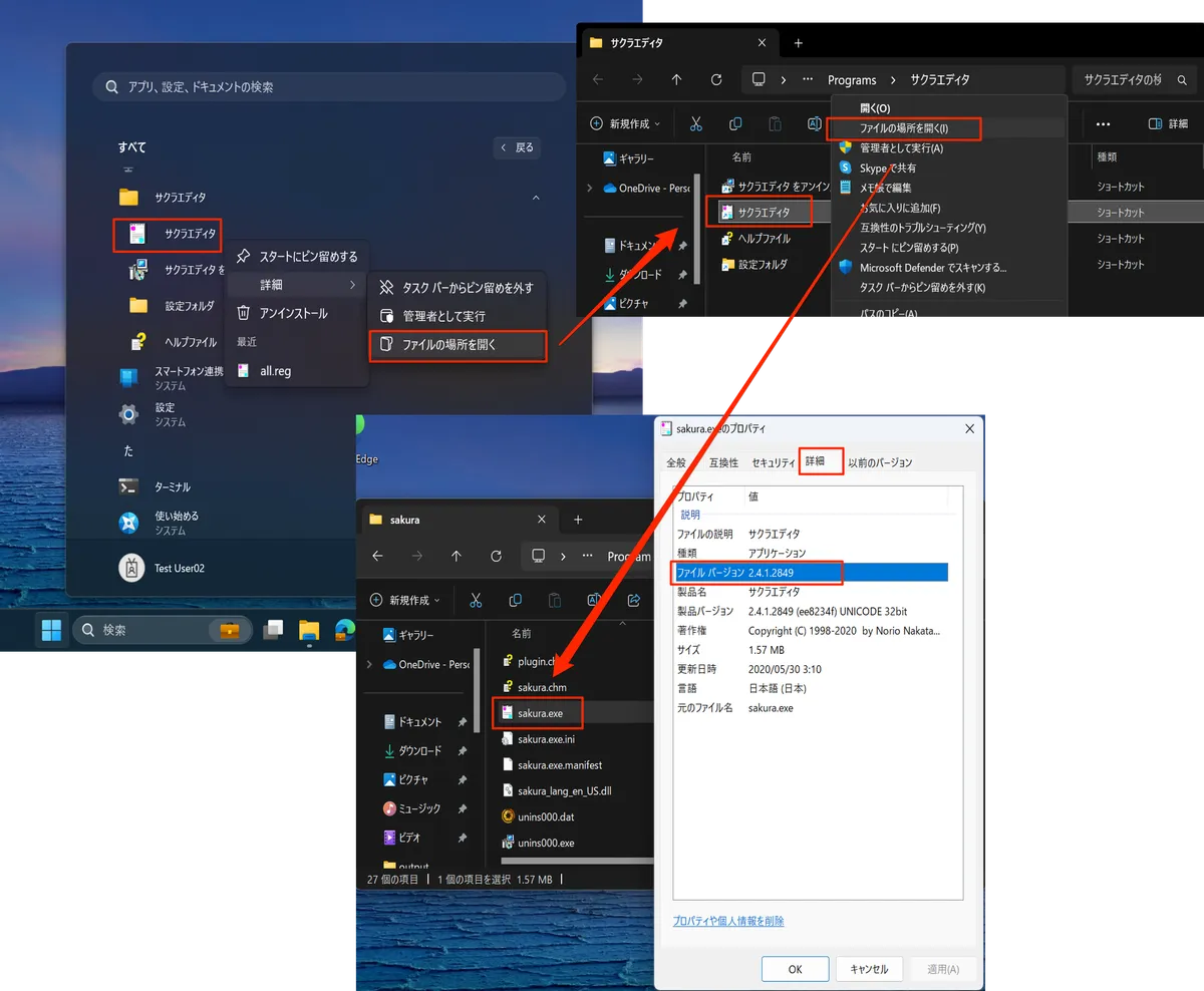 - アプリの実行ファイル (exe) にたどり着いたら、右クリック → 「プロパティ」 → 「詳細」 タブでファイルバージョンを確認