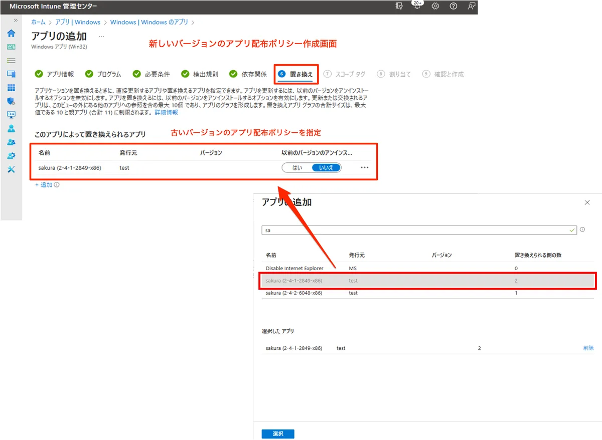 設定自体はとてもシンプルです。新しいバージョンの intunewin ポリシーを通常どおり作成する流れの中で、[置き換え] タブ で古いバージョンのアプリ配布ポリシーを指定するだけです。