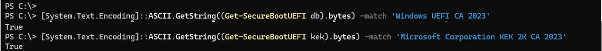 [System.Text.Encoding]::ASCII.GetString((Get-SecureBootUEFI db).bytes) -match 'Windows UEFI CA 2023'