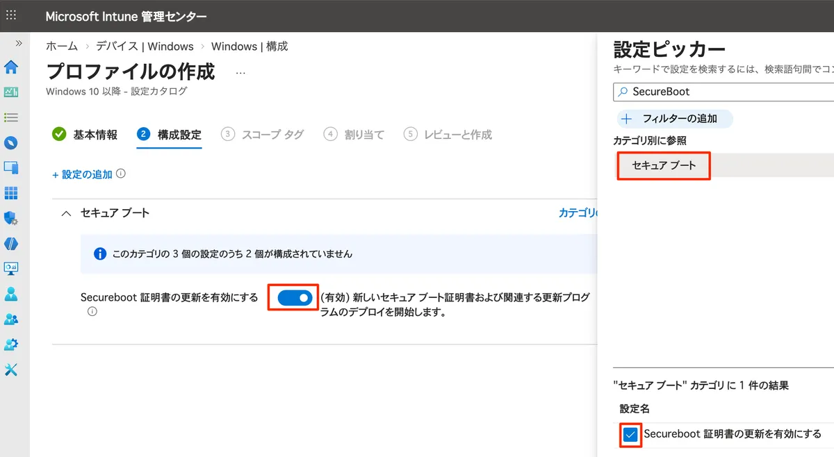 Intune の設定カタログから、セキュアブート証明書の更新を有効化する構成プロファイルを配信できます。