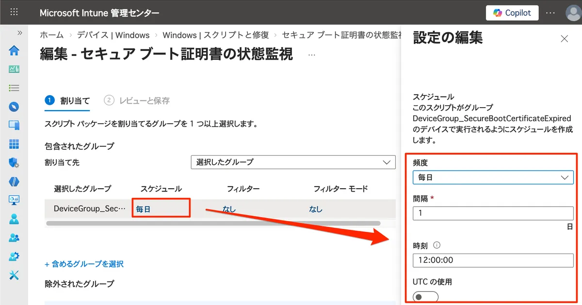 Intune の修復機能を使うことで、PowerShell の検出スクリプトによりセキュアブート証明書の状態をリモートで一括収集できます。収集結果は Intune ポータル上で確認できます。なお、本手順は監視のみのため、デバイスに変更は加えません。