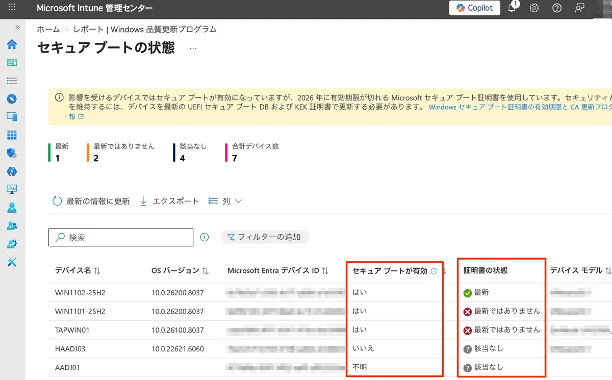 - セキュアブート証明書 (2011 CA) は 2026 年 6 月 から順次期限切れ。セキュアブートが有効な Windows デバイスは証明書の更新が必要