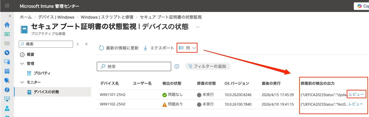 検出の状態 意味 問題なし 証明書は更新済み 問題あり 証明書が未更新 (更新未開始、進行中で再起動待ち、セキュアブート無効など) - [列] をクリックし、[修復前の検出の出力] を追加すると更に詳細なデバイスの状態やファームウェアバージョンなど確認できます。