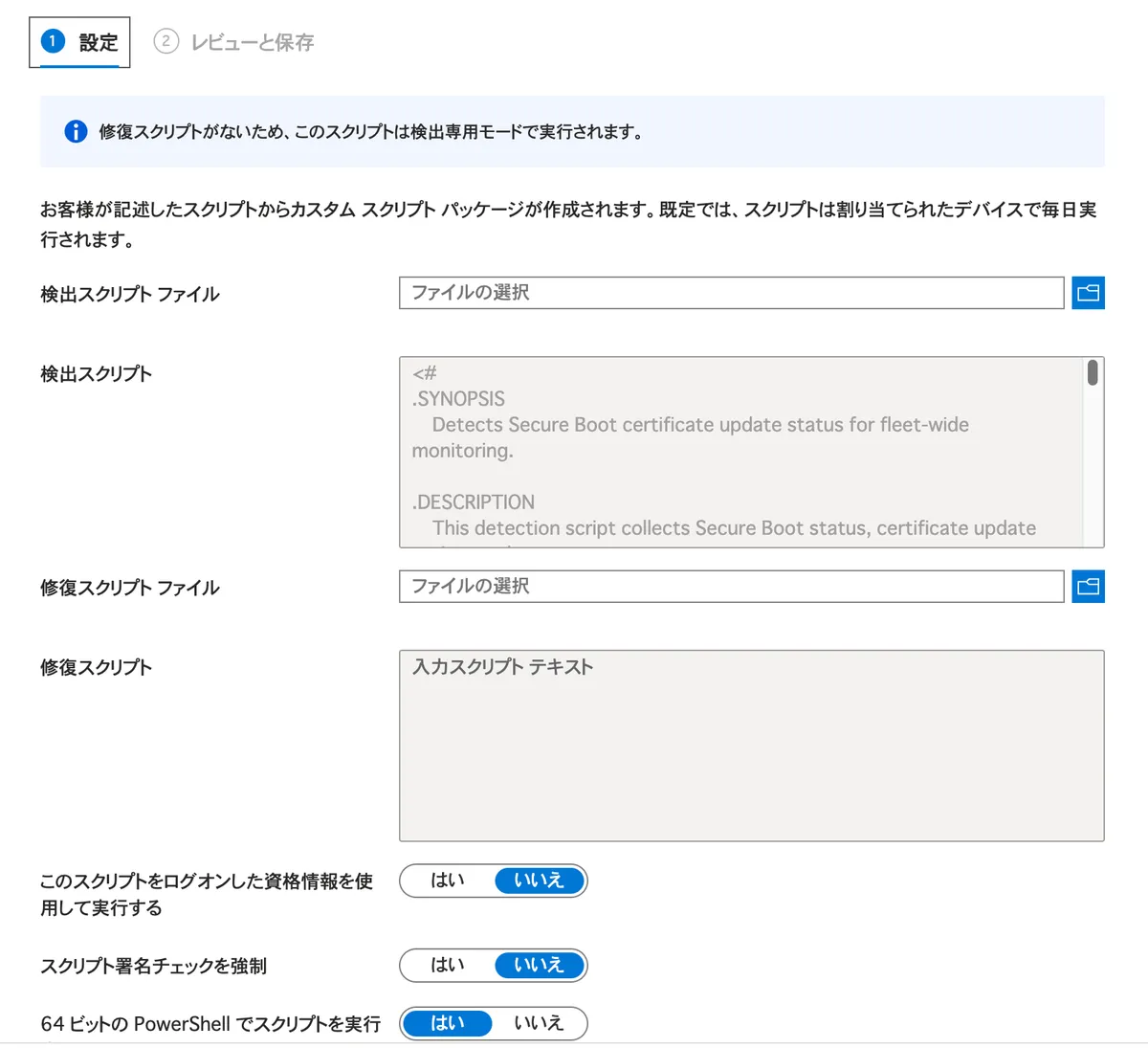 | 検出スクリプトファイル | Detect-SecureBootCertUpdateStatus.ps1 をアップロード |