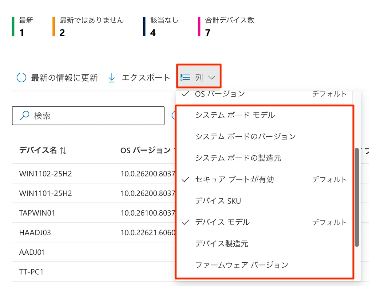"セキュアブートが有効" や "証明書の状態" からセキュアブートの更新状況を確認できます。また、[エクスポート] の右にある [列] をクリックすることで、モデルやファームウェアバージョンなどの追加情報も表示可能です。