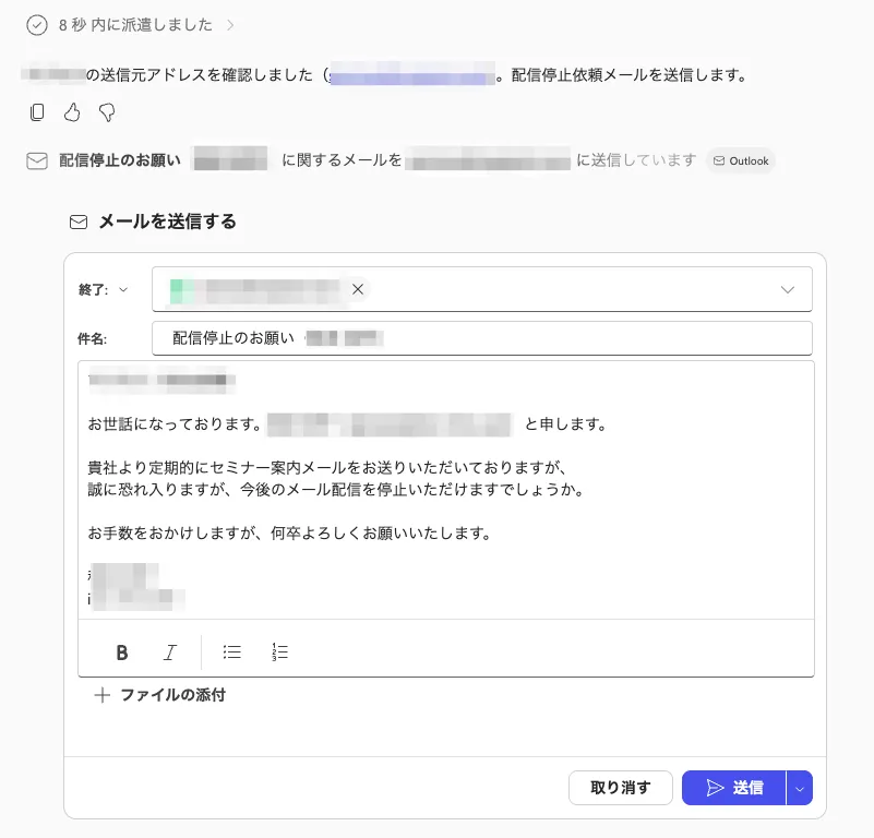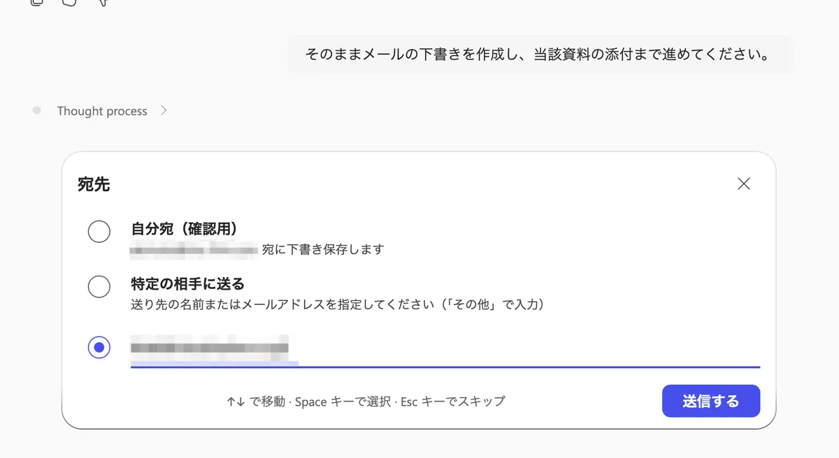 まあ、気を取り直して、そのままメール原案まで作成してもらい、送信してもらうことにします。